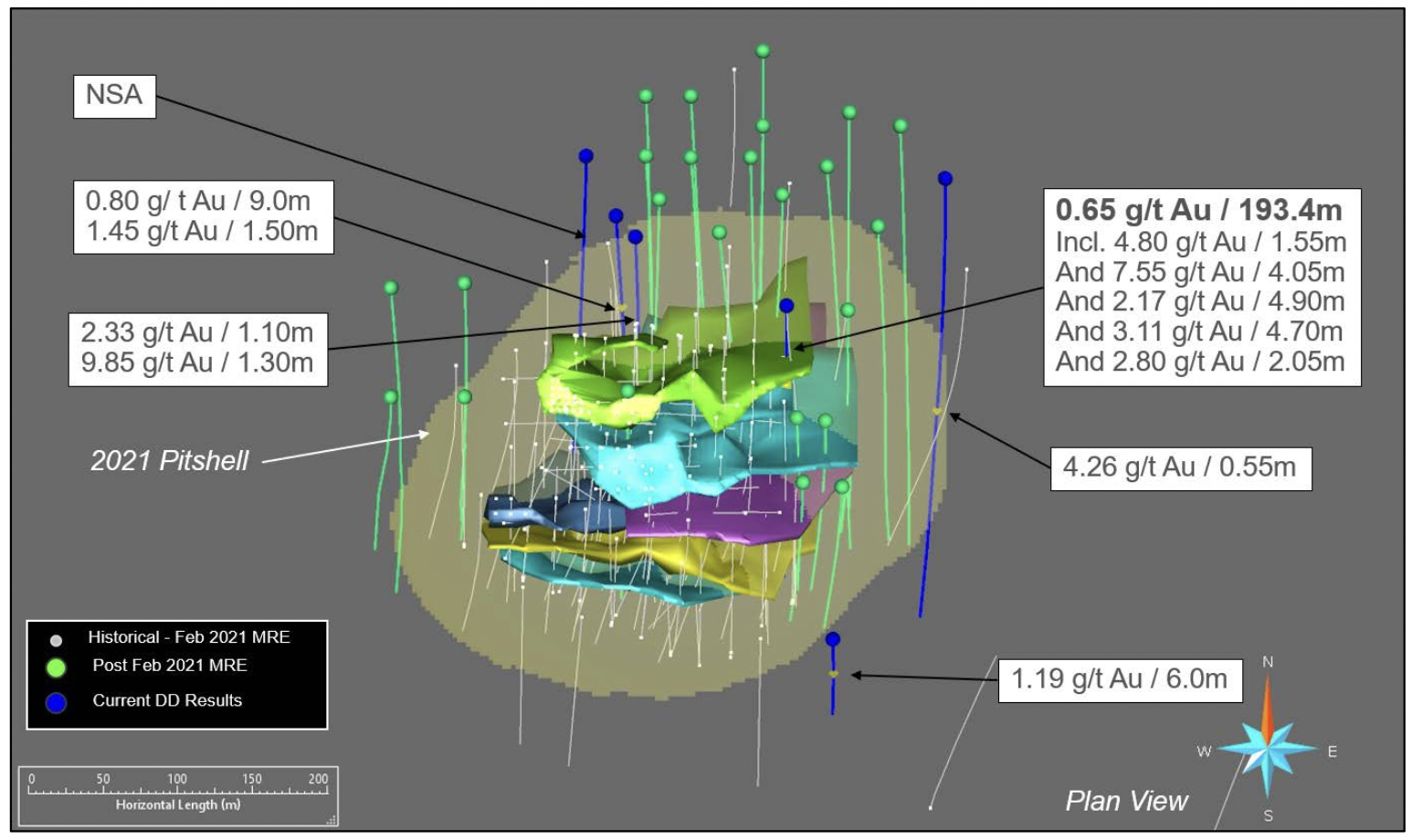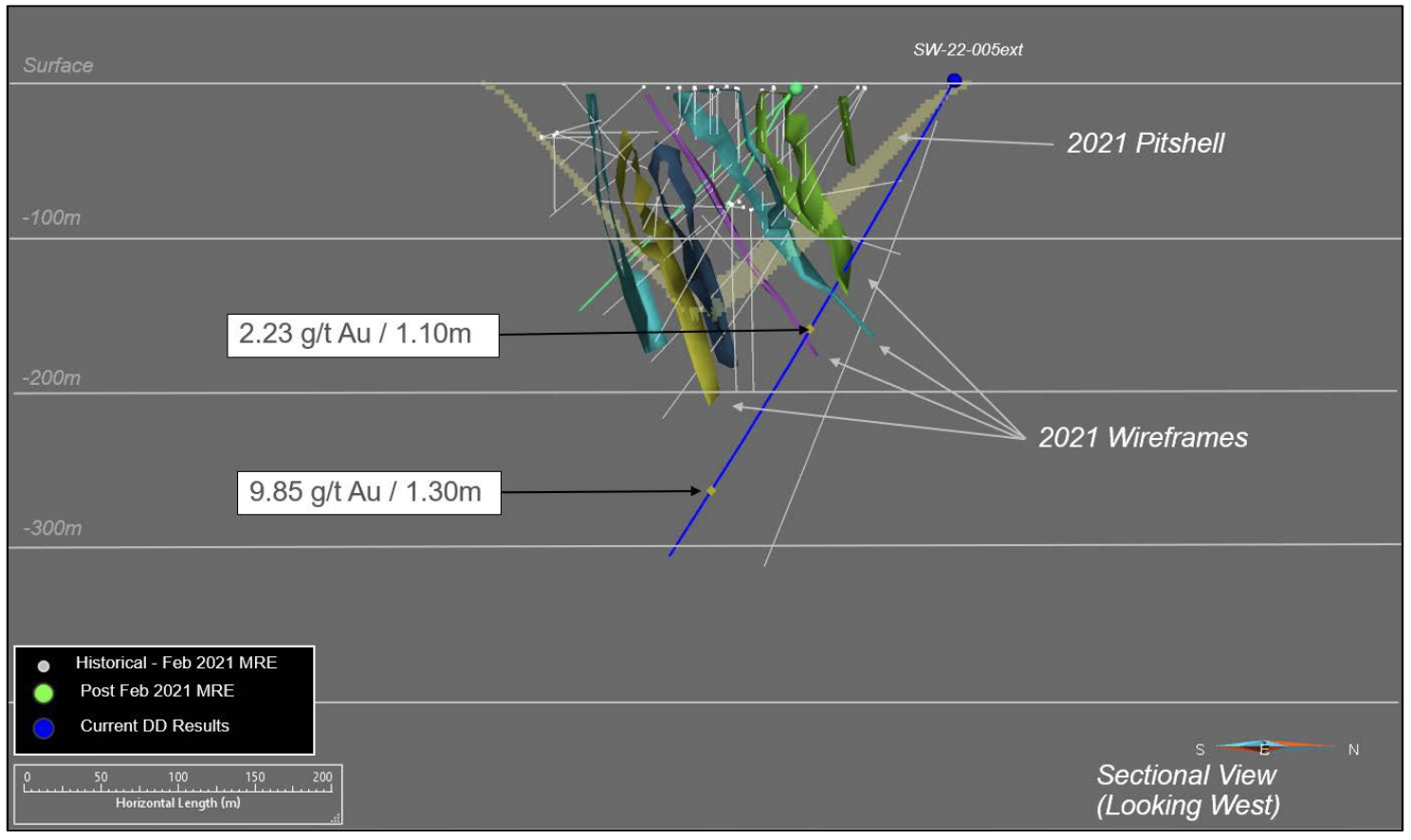 L'intersection la plus importante a été recoupée dans le sondage SW-22-029, avec 0,65 g/t Au sur une longueur impressionnante de 193,4 m, y compris plusieurs sections à plus haute teneur de 4,80 g/t Au sur 1,55 m, 7,55 g/t Au sur 4,05 m, 2,17 g/t Au sur 4,90 m, 3,11 g/t Au sur 4,7 m et 2,80 g/t Au sur 2,05 m. Ce large corridor de minéralisation a été recoupé à l'intérieur et en dessous de l'enveloppe de la fosse proposée et s'étend jusqu'à une profondeur verticale de 230 m (voir la figure 2).