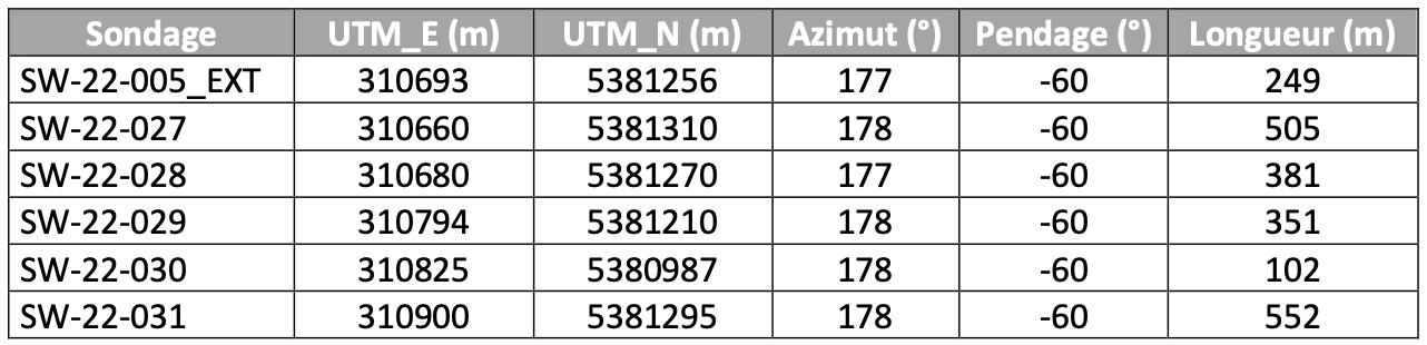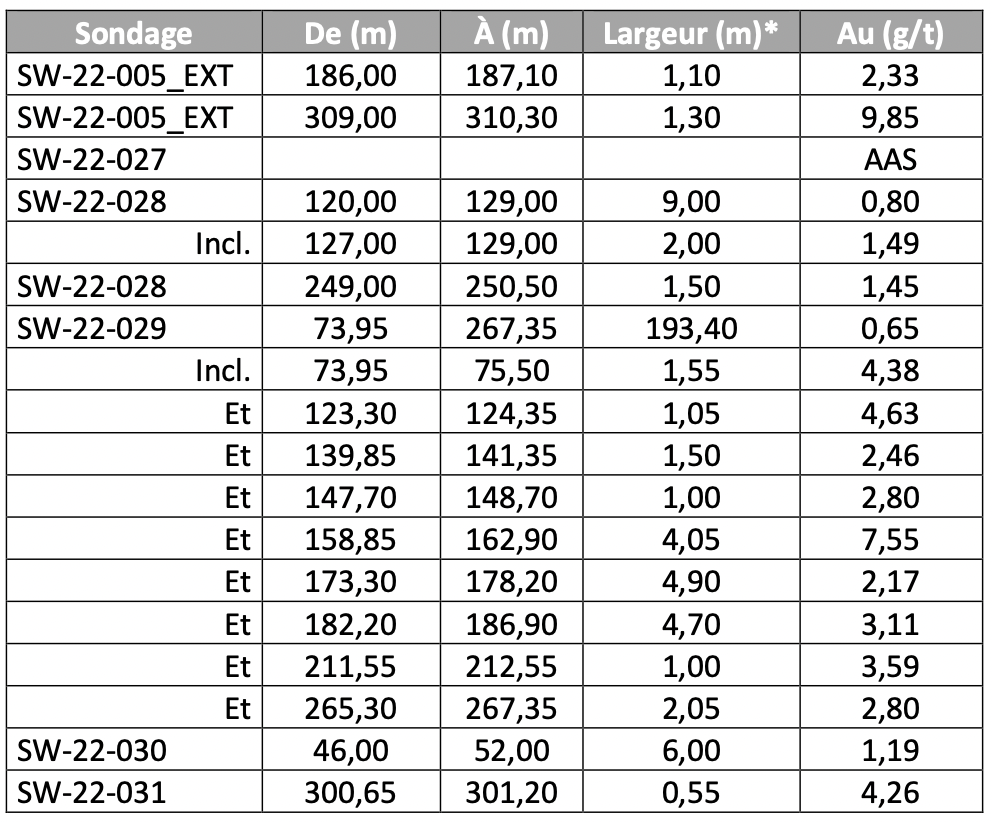 Le sondage SW-22-031, situé à 75 m au nord-est du gisement et des enveloppes minéralisées actuelles, a recoupé 4,26 g/t Au sur 0,55 m, confirmant que la minéralisation est toujours ouverte vers l'est.