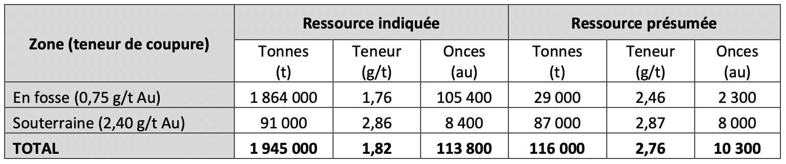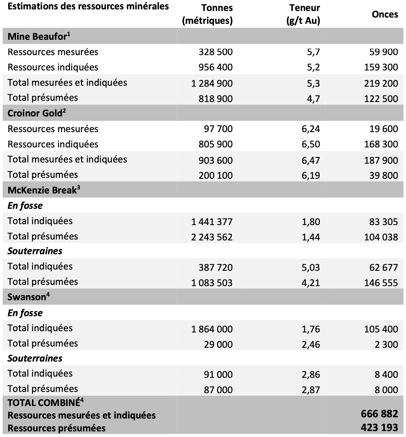 Tableau 4: Estimations des ressources minérales combinées de Monarch