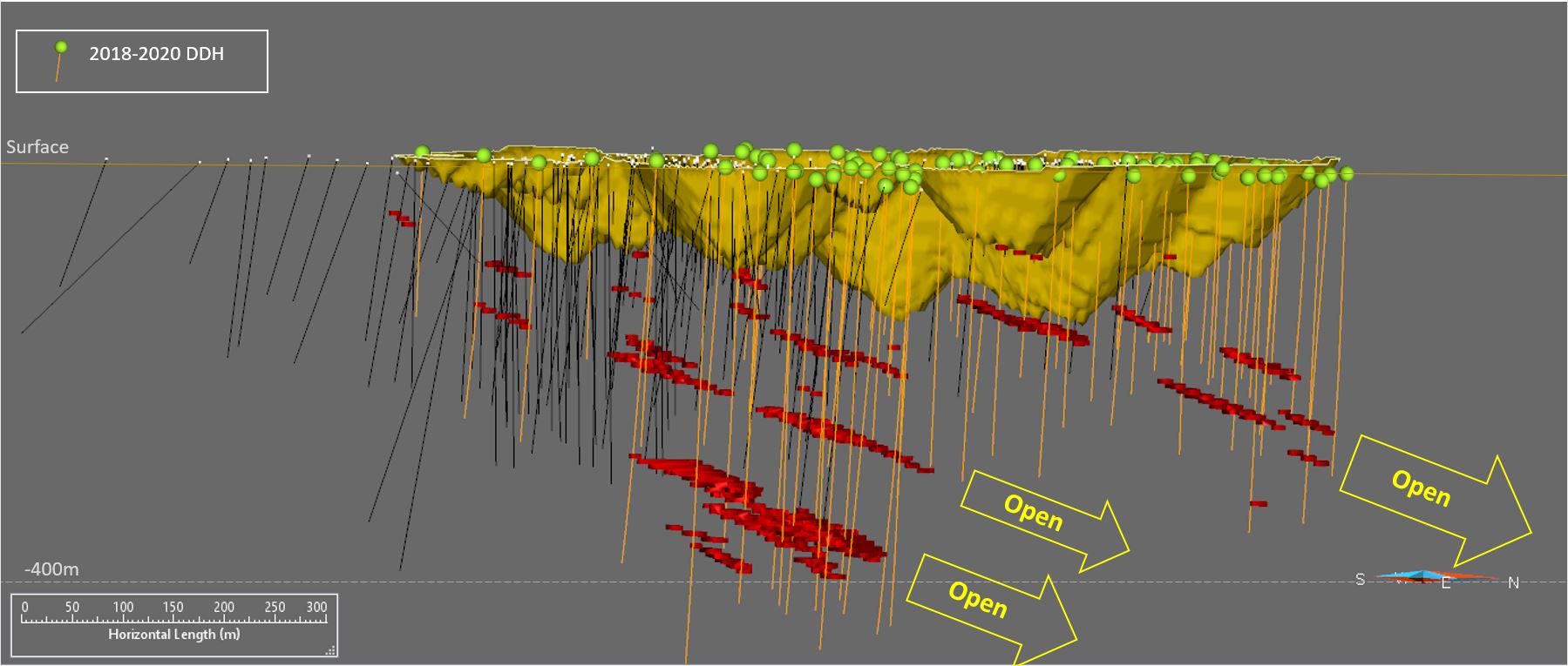 En 2022, Monarch a aménagé une galerie d'exploration avec des baies de forage au niveau le plus bas de la mine (~900 m) afin de pouvoir tester la continuité des zones minéralisées en profondeur.