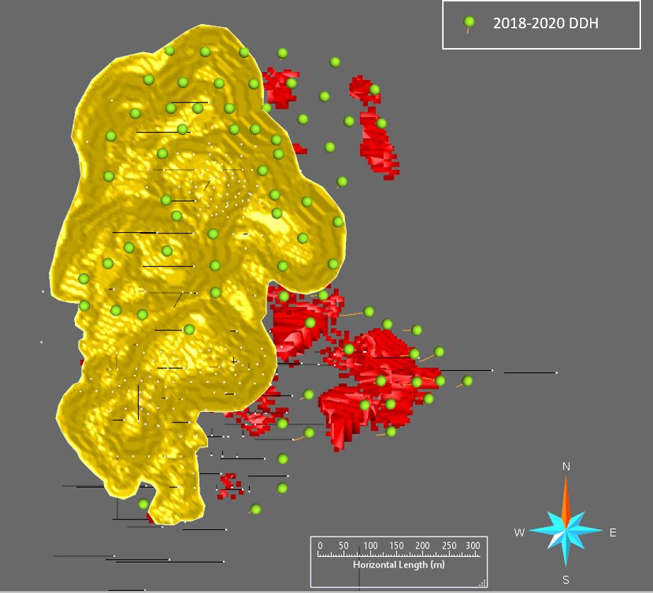 En date du 11 mai 2022, 283 trous totalisant 47 038 mètres avaient été forés au cours du programme d'exploration et de définition. Compte tenu des résultats positifs, des forages supplémentaires sont actuellement en cours afin de convertir les ressources en réserves et de les inclure dans un futur plan de mine.
