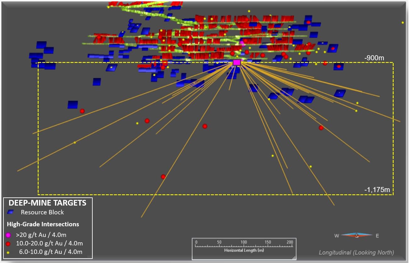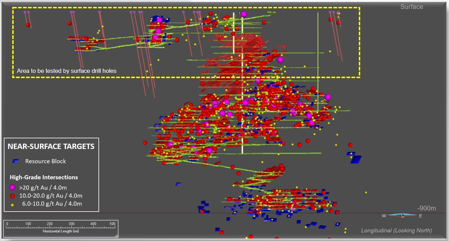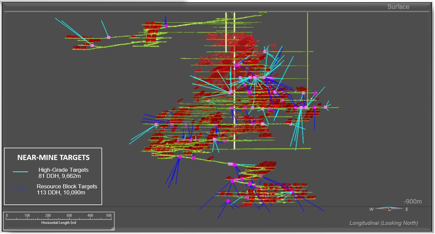 A program of near-mine surface drilling will follow to test both the high-grade and isolated resource block targets that cannot be properly tested from the existing underground infrastructure (see Figure 2). These targets are located near the mine and no more than 300 metres below surface.