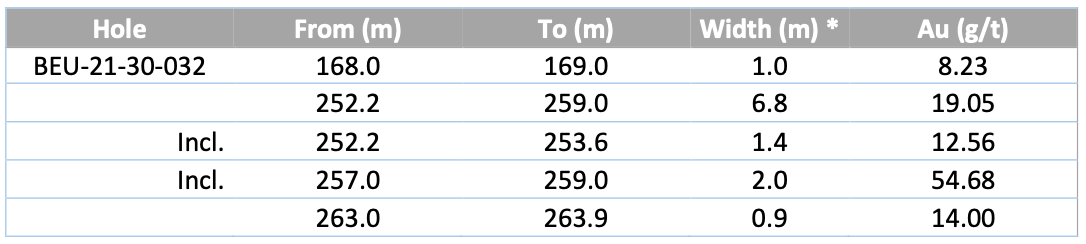 Table 2: Beaufor Mine assay results and significant intervals (Underground Drill Holes)