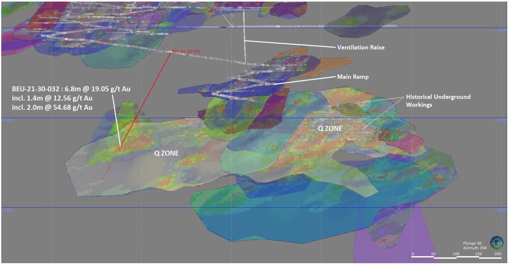 Montreal, Québec, Canada, March 17, 2022 – MONARCH MINING CORPORATION (“Monarch” or the “Corporation”) (TSX: GBAR) (OTCQX: GBARF) is pleased to announce additional results from its 2021 underground drilling program on its wholly-owned Beaufor Mine gold project, located 20 kilometres east of Val-d’Or, Québec. The results presented here come exclusively from hole BEU-21-30-032, targeting the western strike extension of the Q Zone. The target area returned an impressive 19.05 g/t Au over 6.8 m, including 12.56 g/t Au over 1.4 m and 54.68 g/t Au over 2.0 m. These diamond drill results are significant and exciting as they confirm the continuity of this ore zone for at least 150 m westward along strike and 150 m down-dip. The Q Zone has been mined through much of Beaufor’s recent history and has proven to be both continuous and of considerable width. Other holes drilled in the area throughout 2021 also returned positive results. These holes have been incorporated into the new geological model, which includes all recent and historical data and is based on BBA Inc.’s geological interpretation as seen in their 2021 NI 43-101-compliant resource estimate.