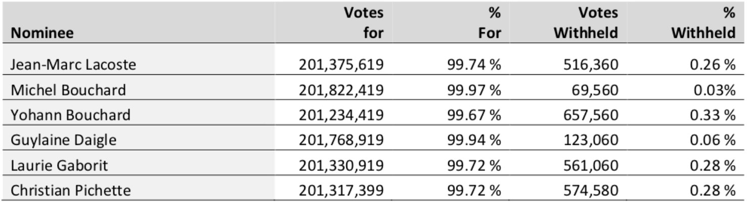 The Arrangement Resolution was approved by 99.92% of the votes cast by the Securityholders, voting together as a single class, at the Annual and Special Meeting of Securityholders held earlier today. To be effective, the Arrangement Resolution required the approval of at least 66 2/3% of the votes cast by the Securityholders, voting as a single class, and a simple majority of the votes cast by the Shareholders after excluding any votes of “related parties” and “interested parties’ and other persons required to be excluded under Canadian Multilateral Instrument 61-101 – Protection of Minority Security Holders in Special Transactions.