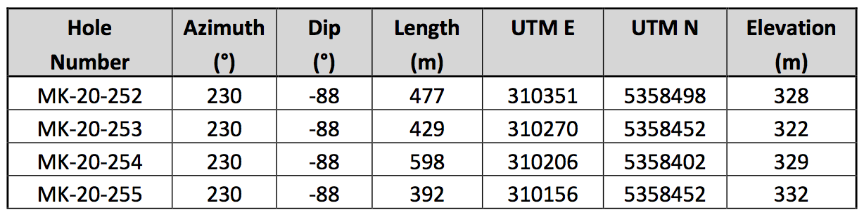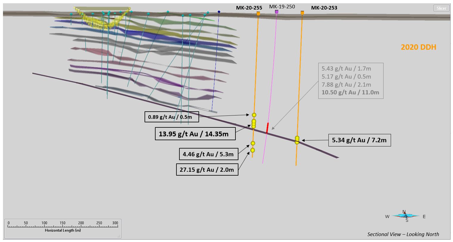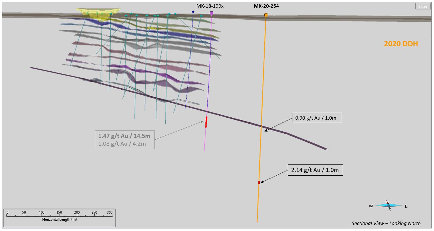 Hole MK-20-253 was drilled 50 metres southwest of hole MK-19-249, which returned 5.28 g/t Au over 13.7 metres, and 50 metres southeast of hole MK-19-241, which returned 26.78 g/t Au over 2.1 metres, including 56.51 g/t Au over 0.5 metres. Hole MK-20-253 returned 5.34 g/t Au over 7.2 metres, including 23.60 g/t Au over 1.0 metre (see Figure 1). The triangulation of these holes, coupled with the holes mentioned in the above paragraph, confirms the gold mineralization trend in this sector of the property. The trend is still open to the south and southeast (see Figure 3).