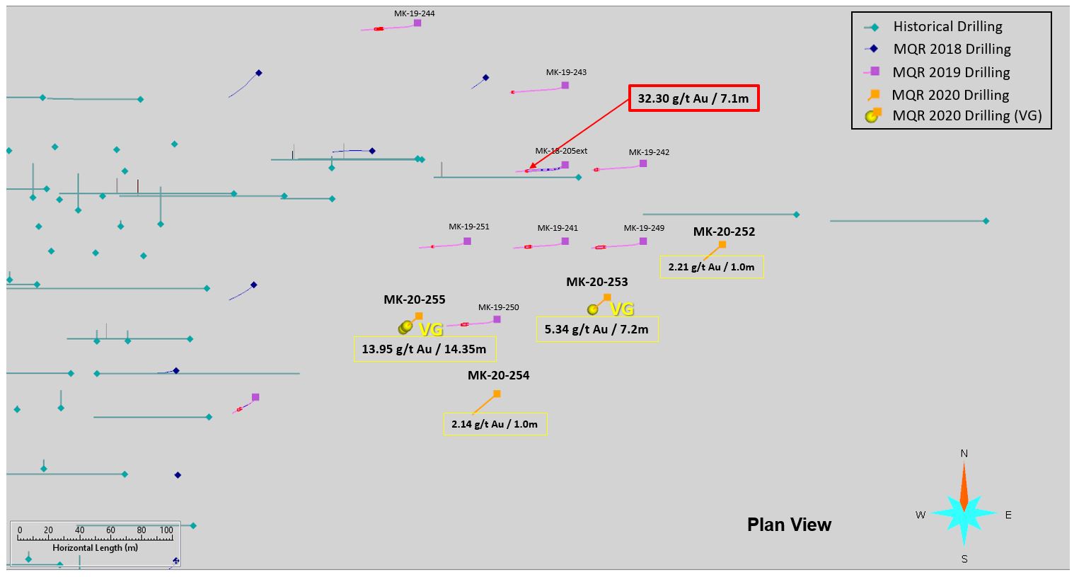 All four holes of the latest program intersected mineralization at the targeted depth, with most containing visible gold. Impressive results from hole MK-20-255 indicate the continuity of the “Number 12” vein and the discovery of a new vein system at depth. The initially targeted Number 12 vein returned 13.95 g/t Au over 14.35 metres, including an impressive 311 g/t Au over 0.5 metres. Below this zone, a newly identified gold-bearing zone returned 27.15 g/t Au over 2.0 metres and 4.46 g/t Au over 5.3 metres, indicating potential for additional stacked veins. This hole, MK-20-255, is 50 metres southwest of hole MK-19-251, which returned 7.04 g/t Au over 6.0 metres, including 25.92 g/t Au over 1.0 metre, and 50 metres west from hole MK-19-250, which returned 10.50 g/t Au over 11.0 metres. Drilling continues to demonstrate strong lateral continuity tested to a vertical depth of less than 400 metres. These holes confirm the continuity of the zone and the increase in grade towards the southeast. The zone is still open to the south and east (see Figure 1 and Figure 2).