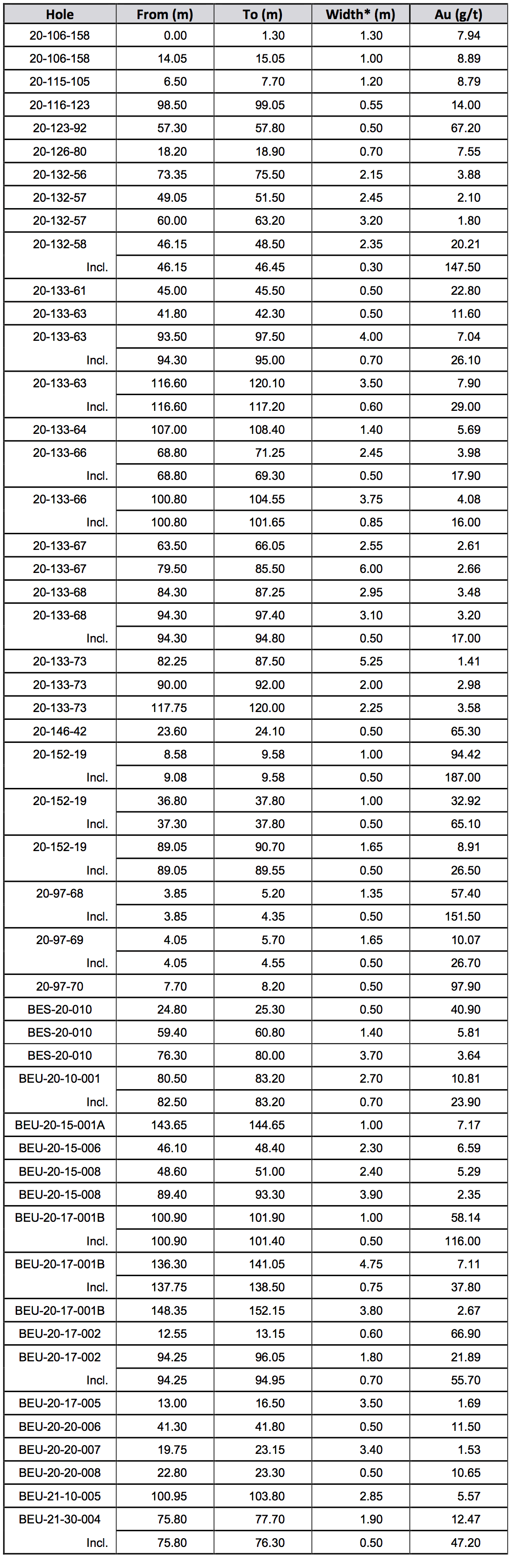 Table 2: Beaufor Mine significant assay results