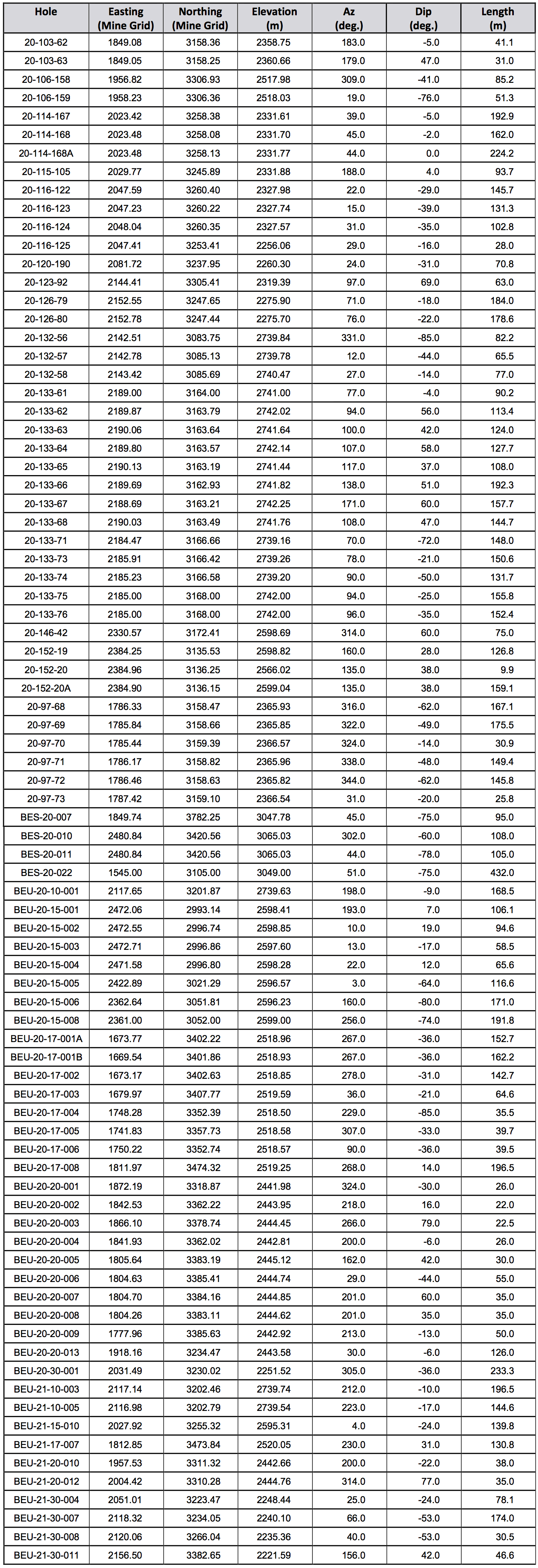 Table 3: Beaufor Mine drill hole location