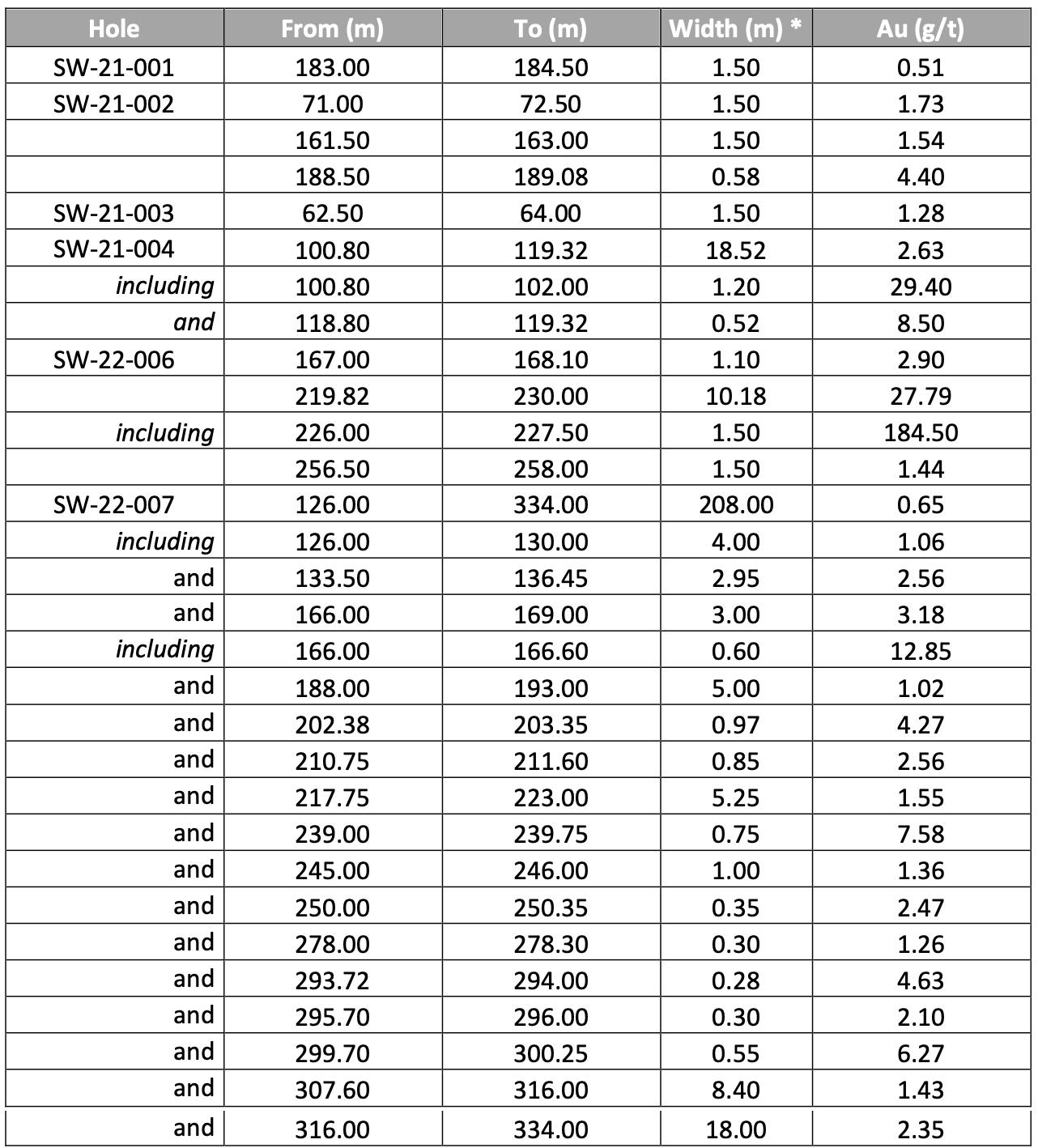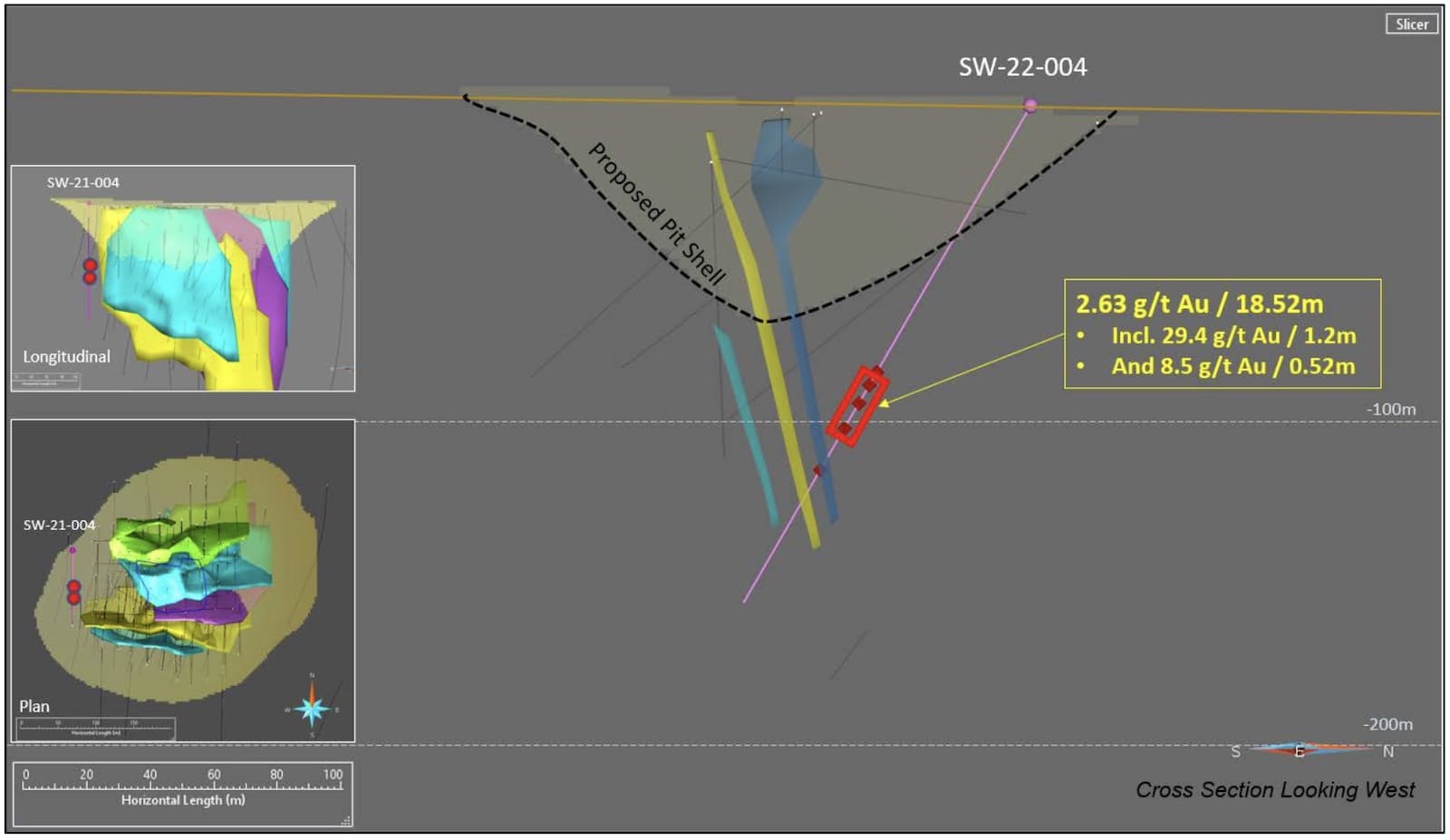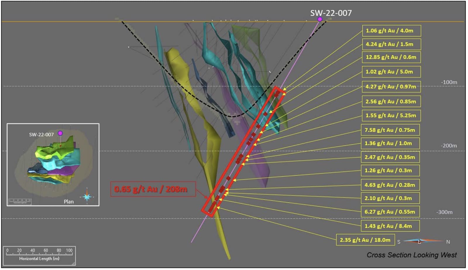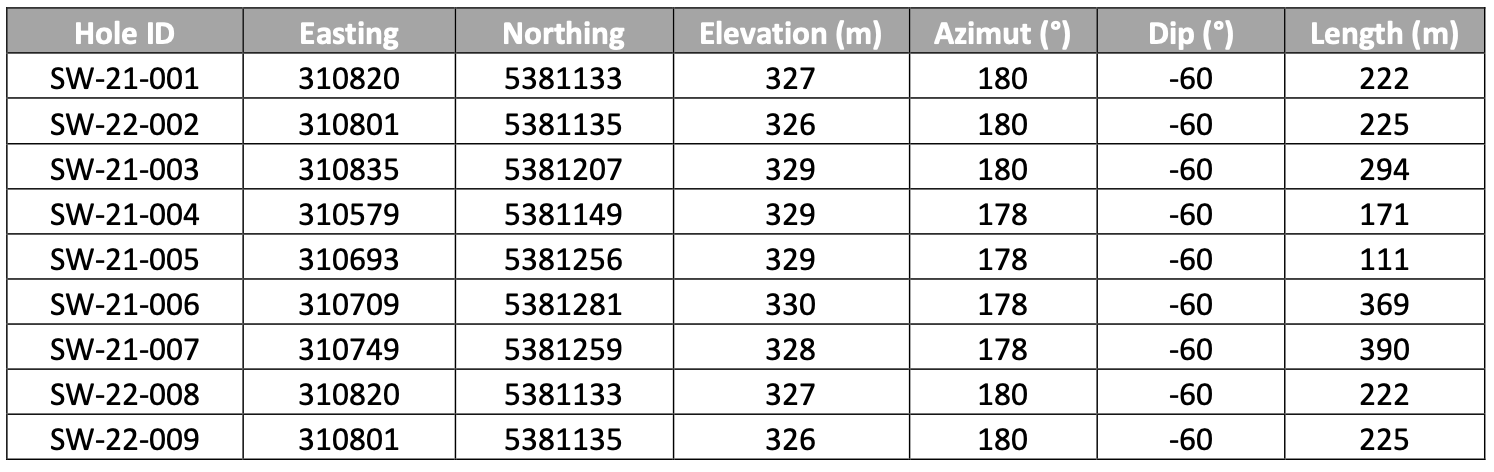 Hole SW-21-007, targeting the area down-dip and outside of the currently proposed pit shell, intersected widespread gold mineralization across the entire width of the mineralized corridor with an average of 0.65 g/t Au over 208 metres, including higher grade sections of 12.85 g/t Au over 0.6 m and 2.35 g/t Au over 18.0 metres.