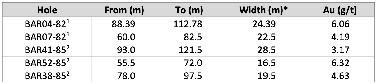 Previous holes drilled in the Swanson deposit area by Lac Minerals Ltd in 1982 (GM40148) and in 1985 (GM42538), which were included in the 2021 NI 43-101 mineral resource estimate, identified high-grade gold mineralization over significant widths. Most of these intersections are within the first 100 metres below surface. The better intersections are shown in Table 1.