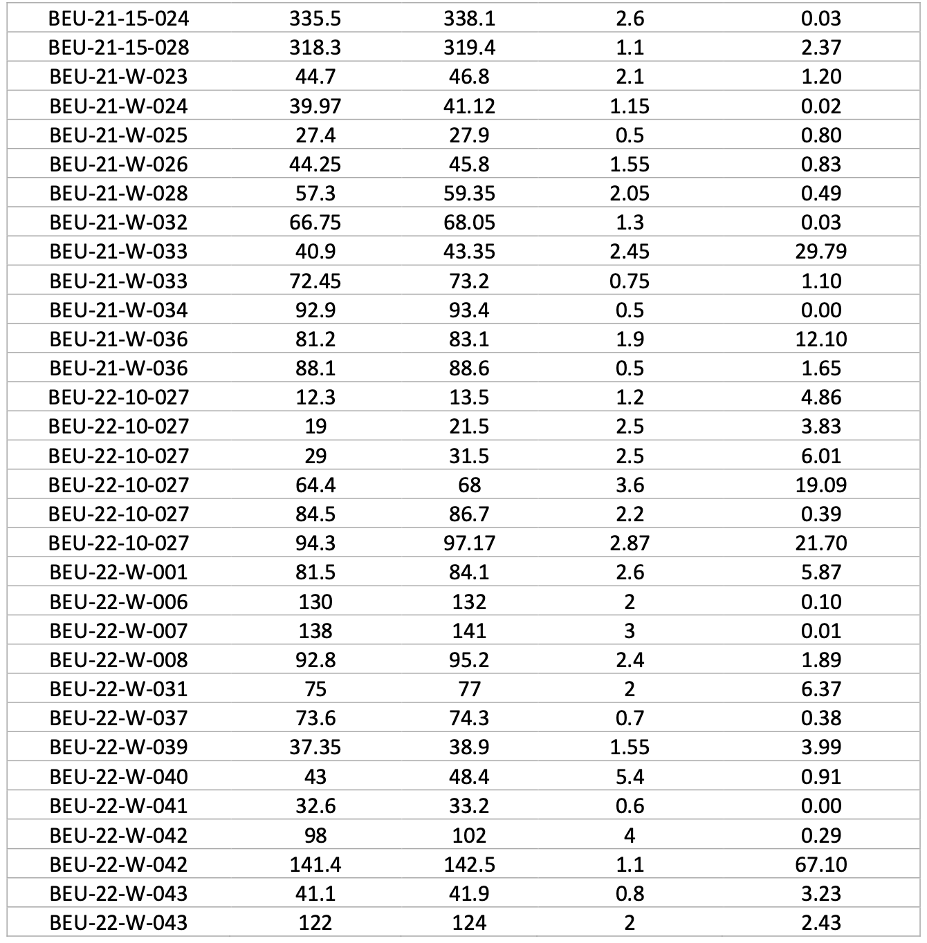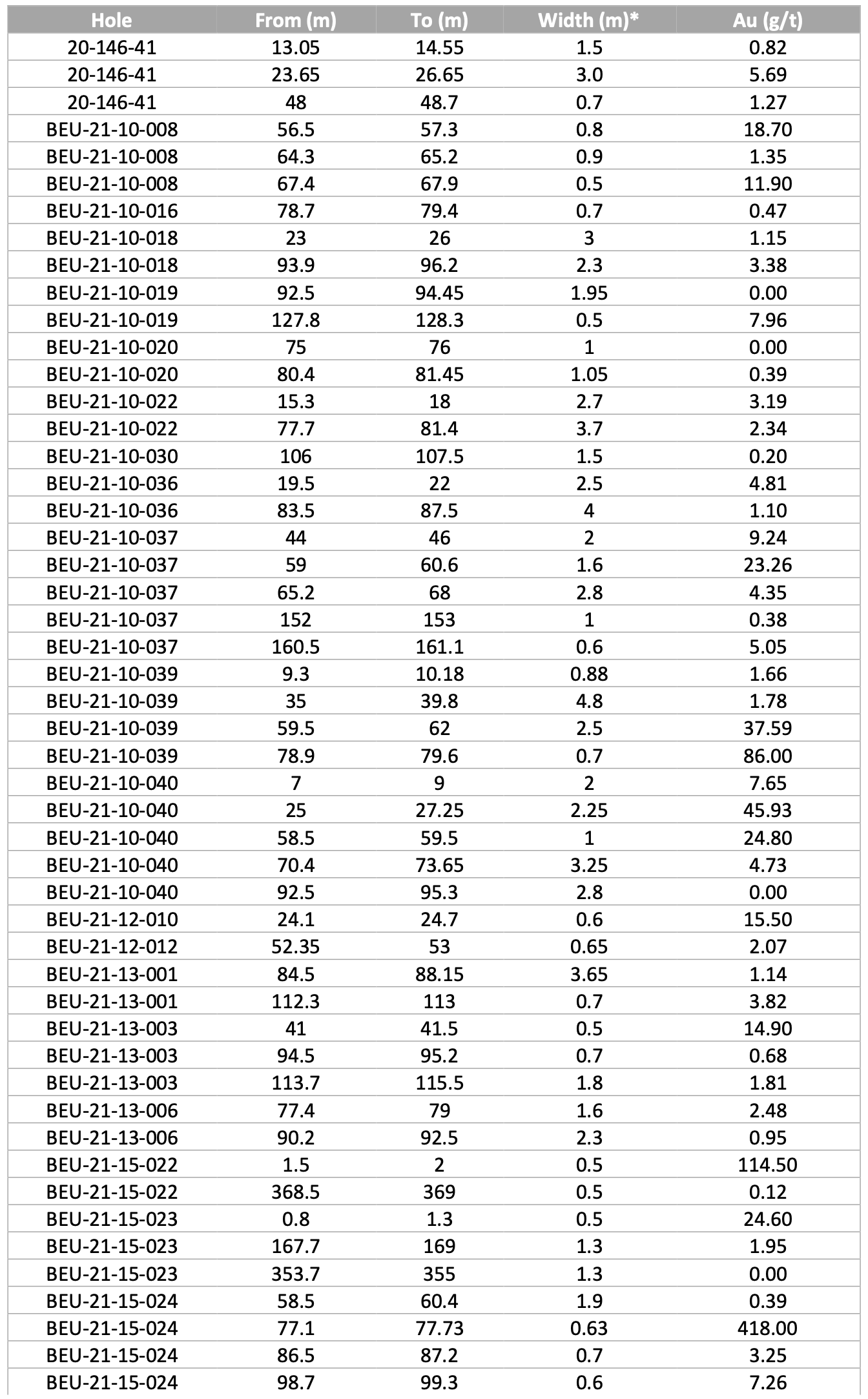 Table 2: Beaufor Mine assay results and significant intervals (underground drill holes)