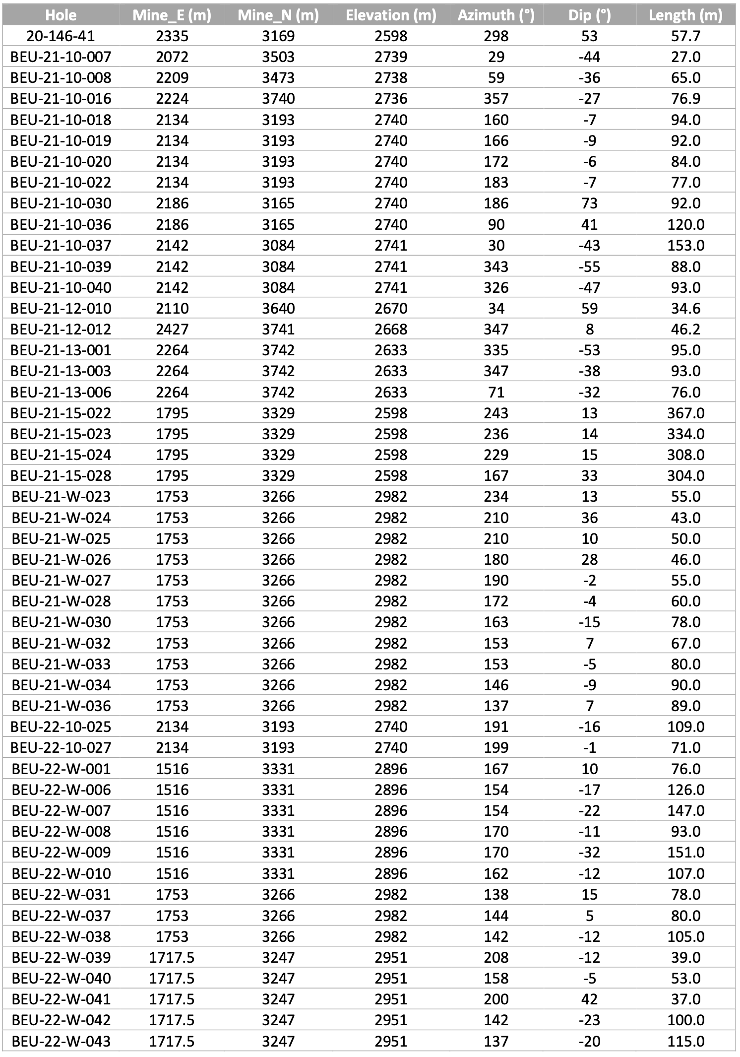 Table 3: Beaufor Mine drill hole location