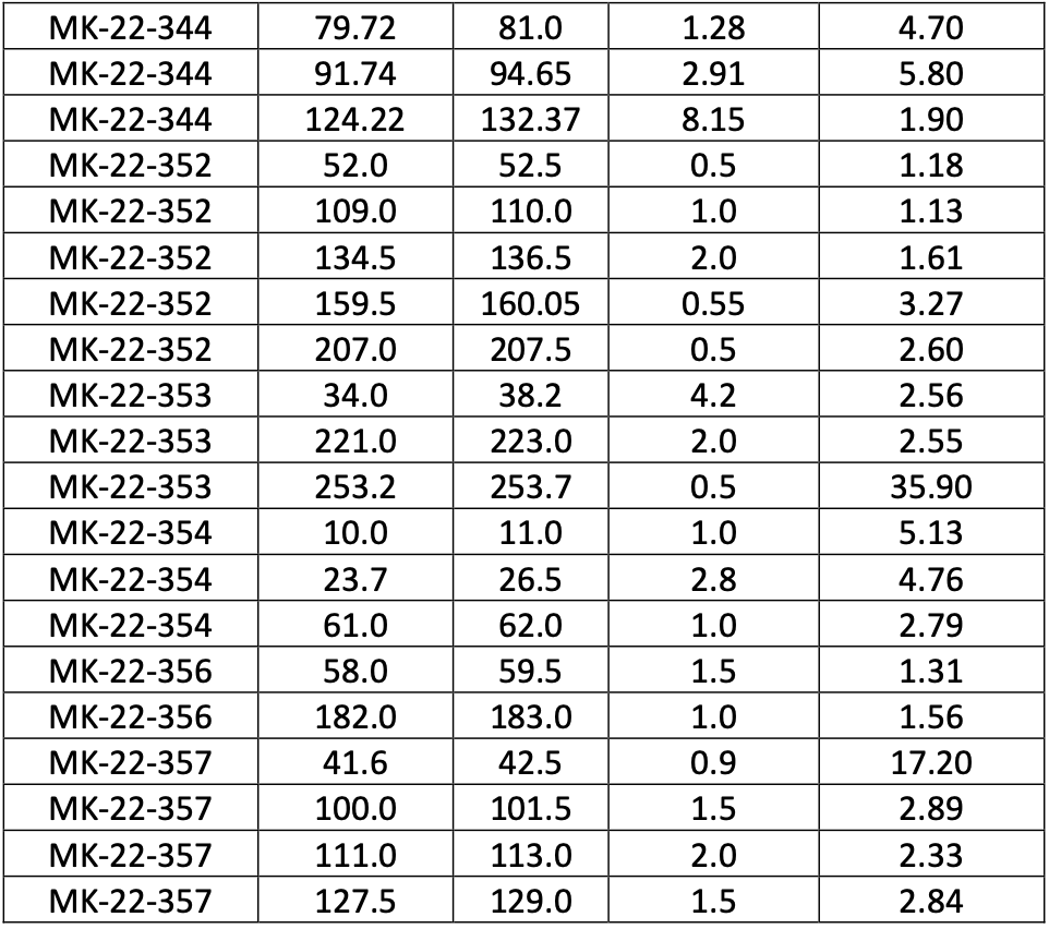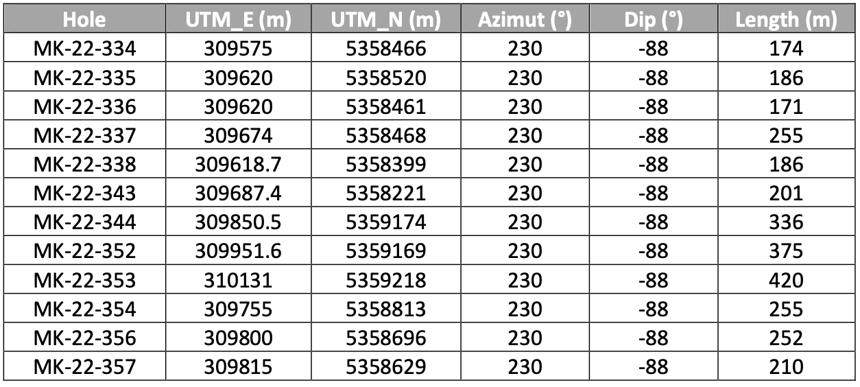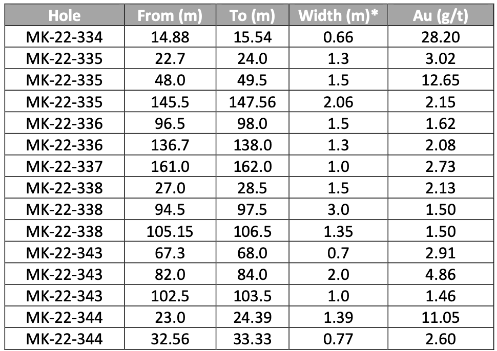 This press release relates to newly received assay results for 12 holes, namely holes MK-22-334 to 338, MK-22-343 to 344, MK-22-352 to 354 and MK-22-356 to 357 (see table 2 at the end of this release). The results for the holes drilled at the northern edge of the deposit include 35.9 g/t Au over 0.5 m and 11.05 g/t Au over 1.3 m, indicating that the mineralization remains open to the north. Drilling in the southwestern part of the deposit returned best intersections of 12.65 g/t Au over 1.5 m and 28.2 g/t Au over 0.66 m, showing that the mineralization also extends in the up-dip direction, thus confirming that the pit shell can be expanded to the west. The three holes drilled within the pit shell limits to fill in larger gaps in earlier drilling returned a best intersection of 17.20 g/t Au over 0.9 m (see Figure 1). Results are pending for the remaining 30 holes.