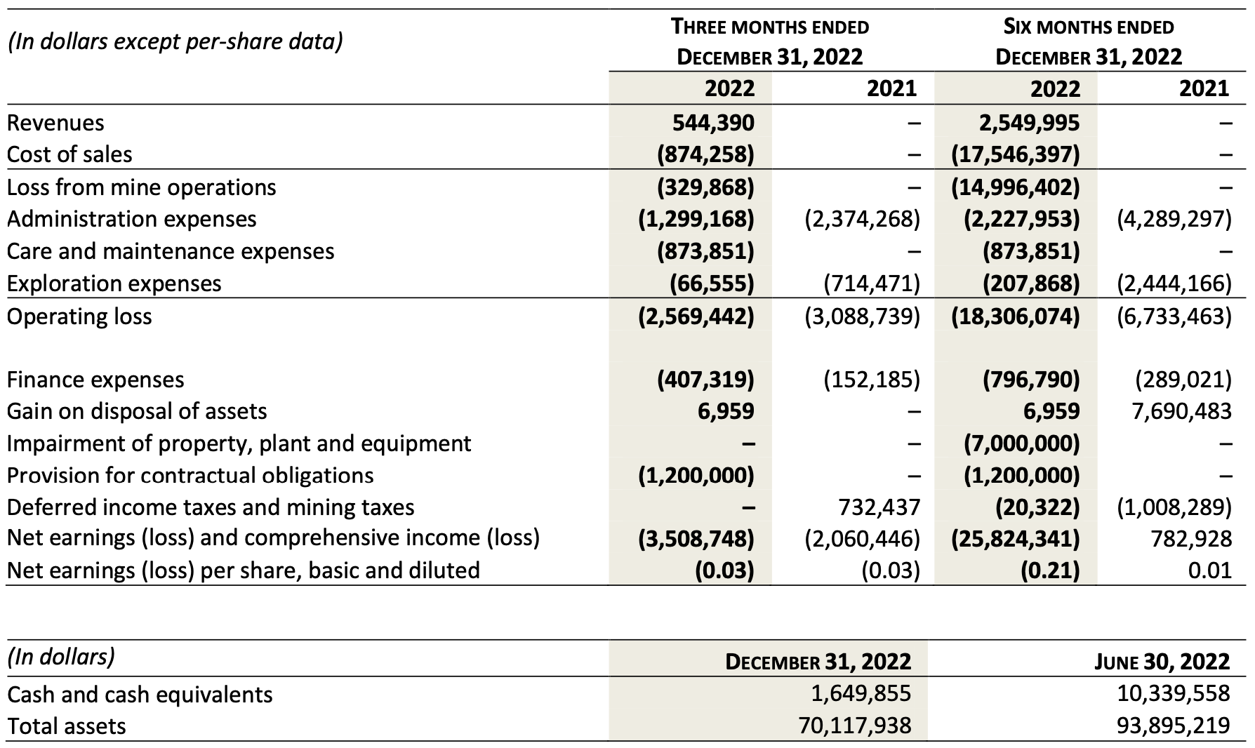 Montréal, Québec, Canada, February 13, 2023 – MONARCH MINING CORPORATION (“Monarch” or the “Corporation”) (TSX: GBAR) (OTCQB: GBARF) reported its results today for the second quarter ended December 31, 2022. Amounts are in Canadian dollars unless otherwise indicated.