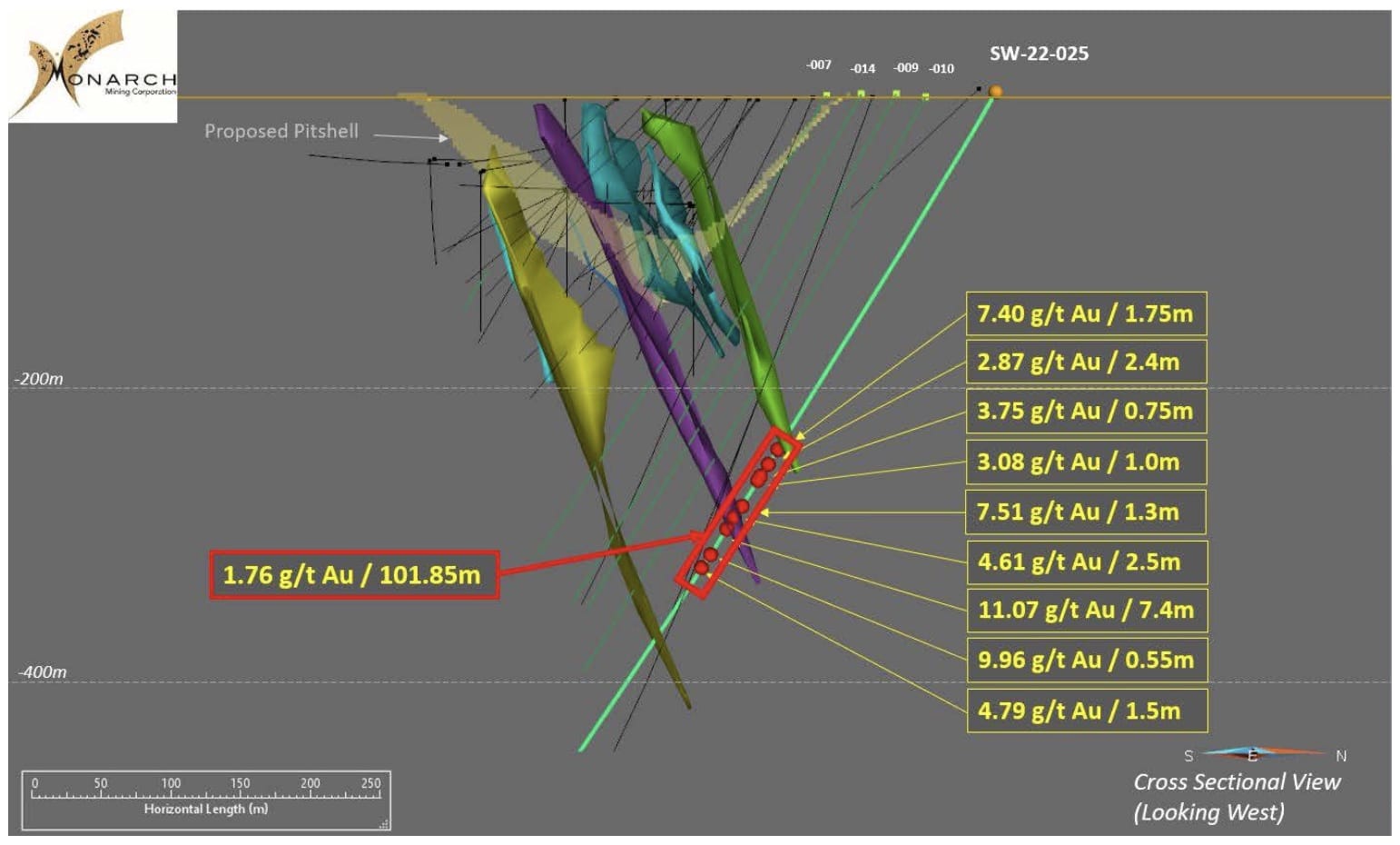 “We continue to establish the continuity of the mineralized corridor at depth,” said Jean-Marc Lacoste, President and Chief Executive Officer of Monarch. “These drill results push the limits of the mineralization even further out from the currently defined mineral resource envelope and the proposed pitshell.”