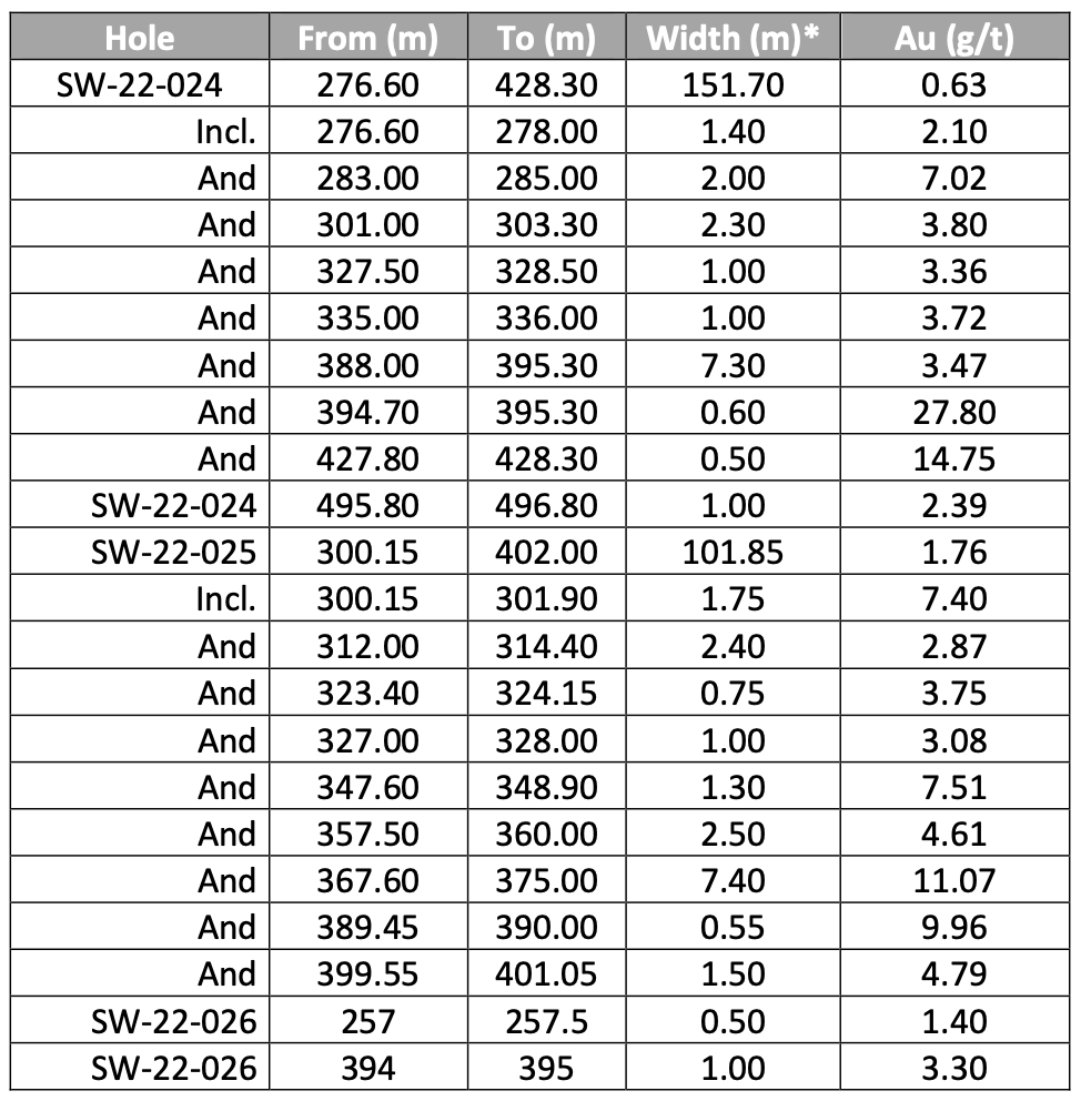 Holes SW-22-024 and SW-22-025, located 100 m apart on the surface, intersected multiple gold-bearing zones within a very wide mineralized corridor that has been traced to a vertical depth of 430 m. The highest-grade interval returned by the reported holes within the corridor included a segment grading 11.07 g/t Au over 7.40 m. The mineralized corridor has been defined by diamond drilling and extends down plunge to the northeast.